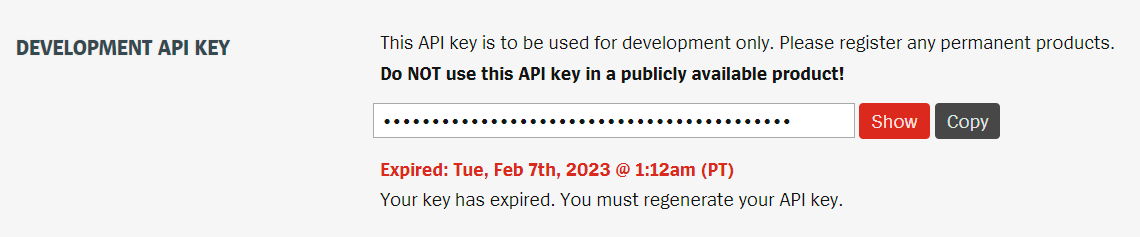 PRODUCTION KEY(실제 서비스용)와 PERSONAL KEY(개인 공부용)가 있는데, 개인용 키는 요청 횟수에 대해 큰 제약이 있다.(1초 20번, 2분에 100번)