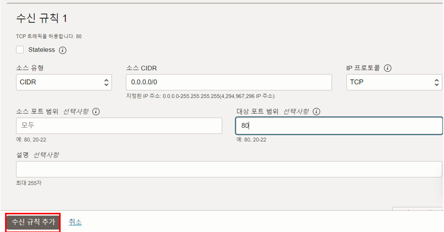 2) 대상포트 범위에 80,443 또는 원하는 포트 작성