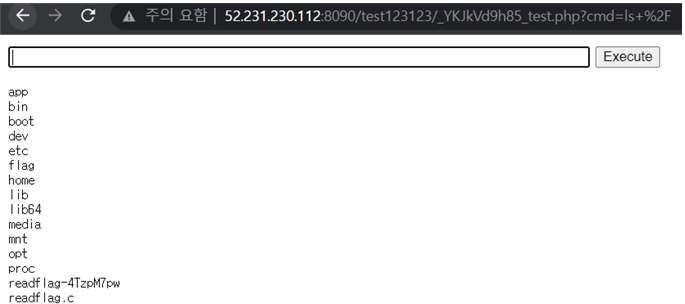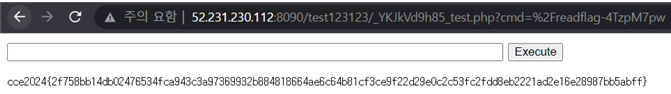 이를 이용해 웹쉘을 업로드 하고 실행시킬수 있다면 랜덤값이 붙은 플래그 실행 파일역시 실행에 문제가 없을 것이다.