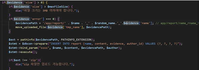zip 파일 외에 업로드를 허용하지 않는 것처럼 보이지만, 업로드 후 die() 함수를 실행시키므로 업로드시 파일 확장자 제한은 없는셈이다.