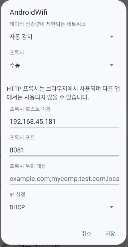 설정이 되었다면, 본인의 ip(ipconfig 으로 확인)와 설정한 포트 (본인은 8081)로 프록시 세팅을 해줄 수 있다.